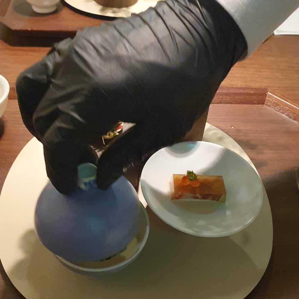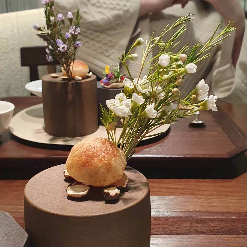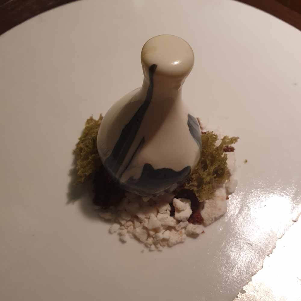 여덟번째 디저트 청호백자. 첨에 좋았다가 메인에서는 그냥 밥먹는 느낌이라 실망하려 했는데 디저트에서 박수가 나옵니다. 맛있어요. 눈으로 보기도 신기했고 맛도 있고. 이걸 어떻게 만들었지 하는 생각도 들어요. 겉은 초코로 코팅되어 있고 안에는 아이스크림 크림 등이 들어가 있었습니다.