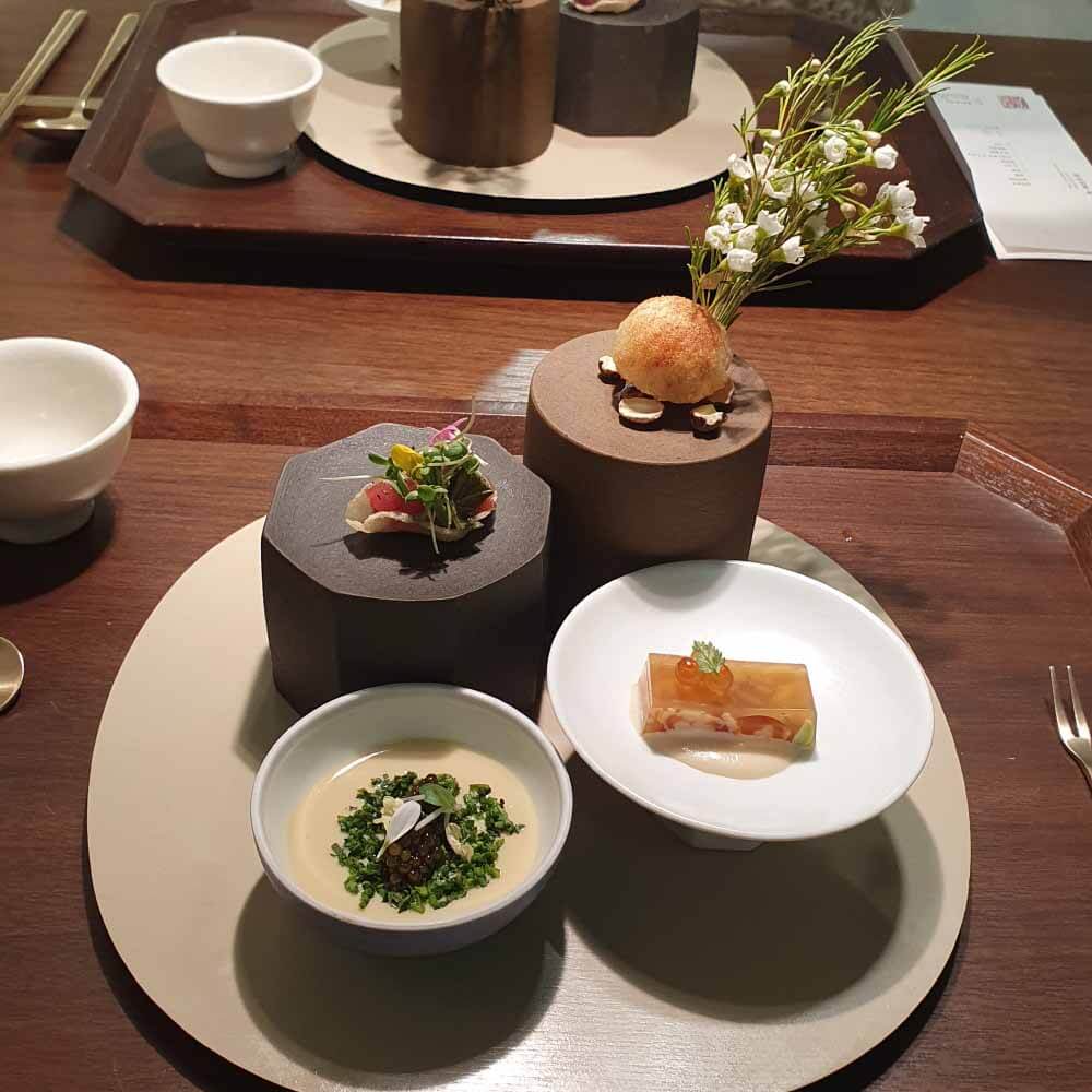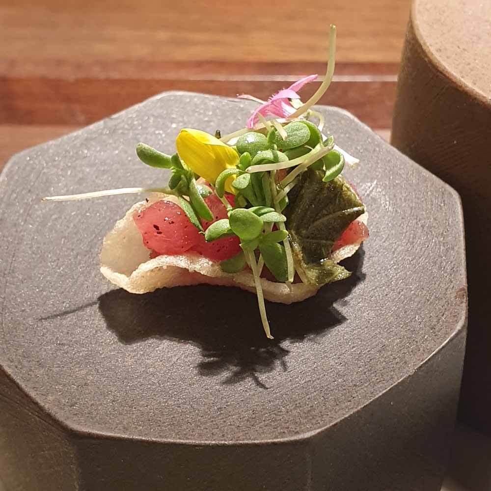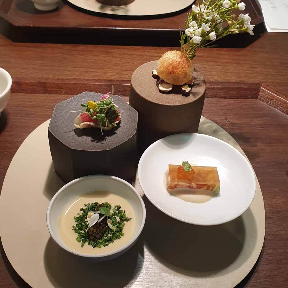 첫번째 한입 요리가 나옵니다. 이거 나올때는 감동합니다. 너무 예쁘거든요. 그릇도 예쁩니다. 그릇 위에 올라간 음식은 더 예쁘네요.