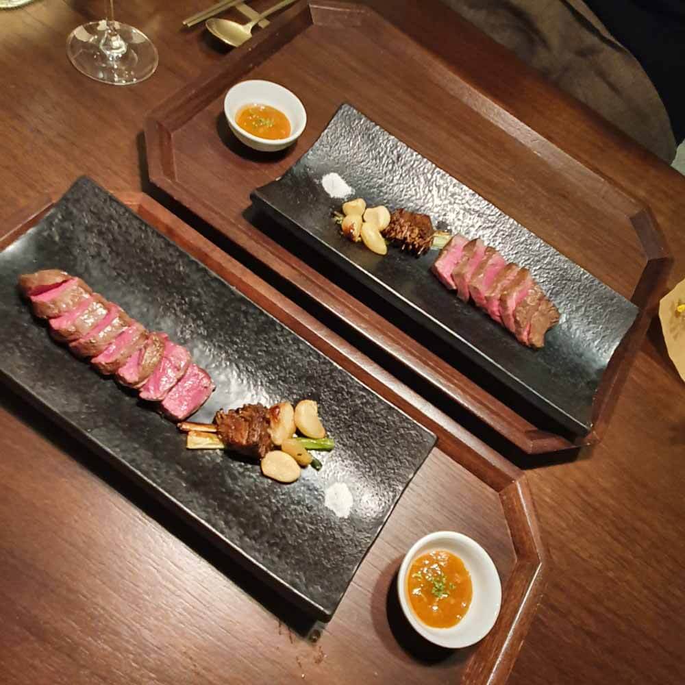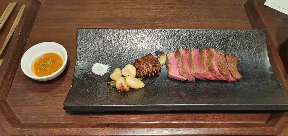 일곱번재로 소고기가 나옵니다. 초벌을 이렇게 해주고 와규? 구워 먹는것처럼 오른쪽에 화로를 올려 줍니다. 초벌로 먹기도 하고 화로에 올려 먹기도 합니다. 뭔가 여기서 좀더 뭔가 더 있었으면 좋지 않았을까 하는 생각이 들었습니다. 앞에 한입요리나 이런 부분에서는 설명도 많이 해주고 볼거리도 많고 먹는것도 새롭고 음~ 소리가 나왔는데 고기도 그런게 있지 않을까 기대 했는데 아쉬웠어요. 그릇이나 이런 것도 좀 아쉽고. 데코도 없고 그냥 식당 느낌. 소고기도 맛이 없지는 않은데 한우 소고기나 백화점에서 사먹는 한우 A급 보다는 좀 아쉬웠습니다. 개인차가 있어서 그냥 이렇게 먹은 사람도 있구나 하고 지나가 주세요.