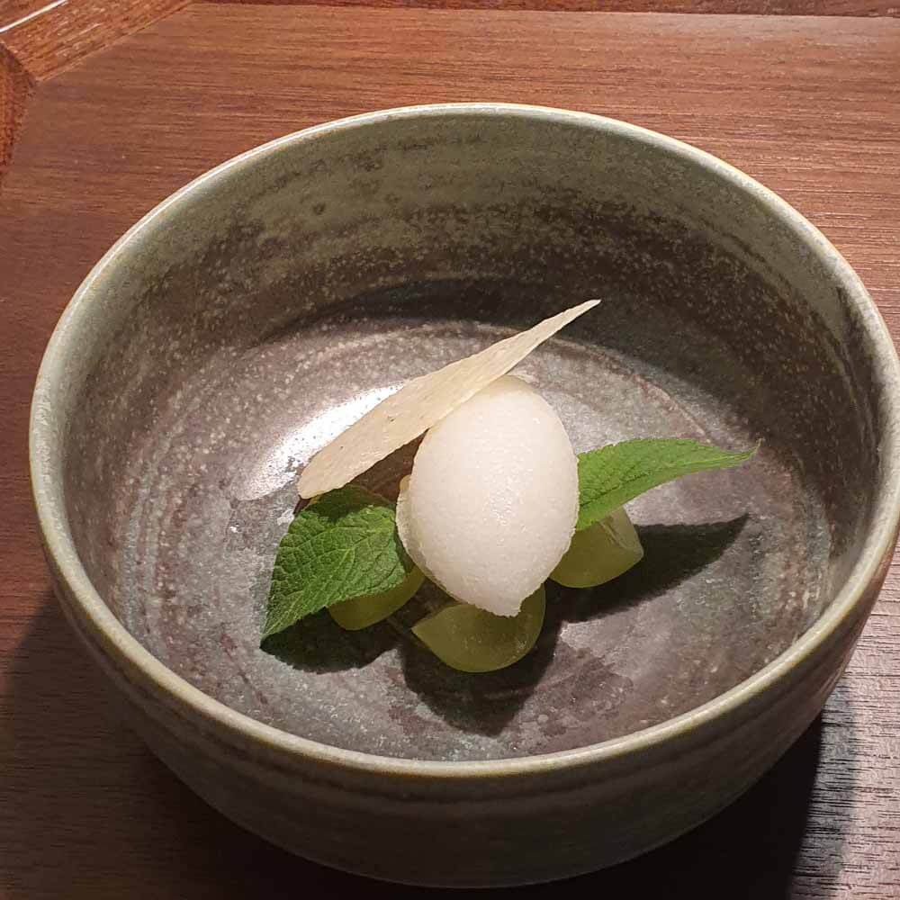 여섯번재 나온건 첨밀설. 샤베트 였습니다. 이거 맛잇었어요. 주시기 전에 메인으로 가기전에 입 맛을 다시 리셋 시키는 음식이라고 설명해주셨어요. 이 다음이 소고기 여서 그랬던것 같습니다.